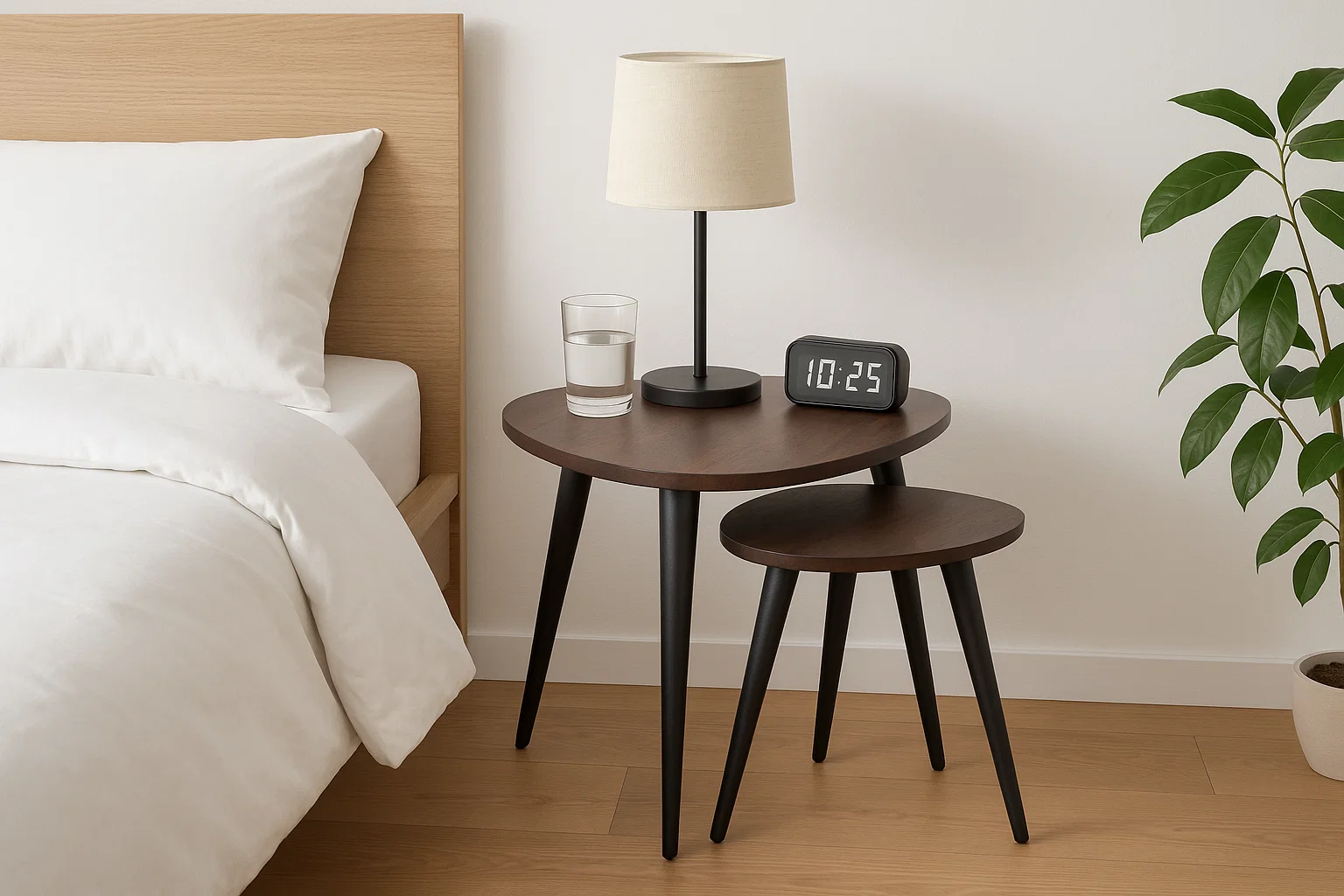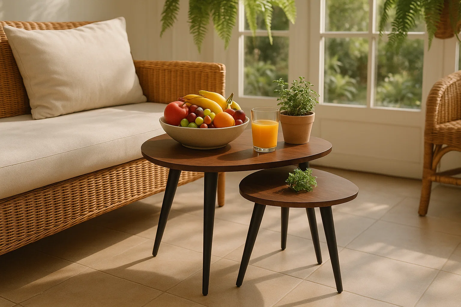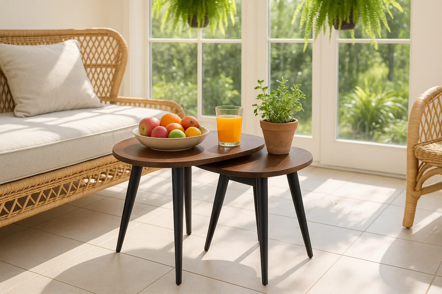 Natural warmth meets modern design in this Nest Table Set made from mango wood with a rich walnut finish. Supported by powder-coated steel legs, this set adds coziness and utility to any room—be it a bedroom corner or a living room lounge.