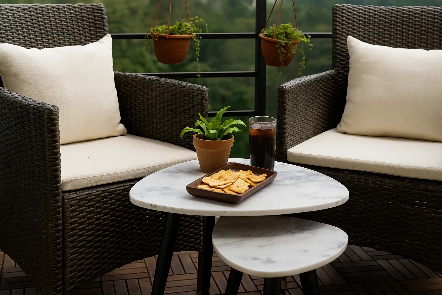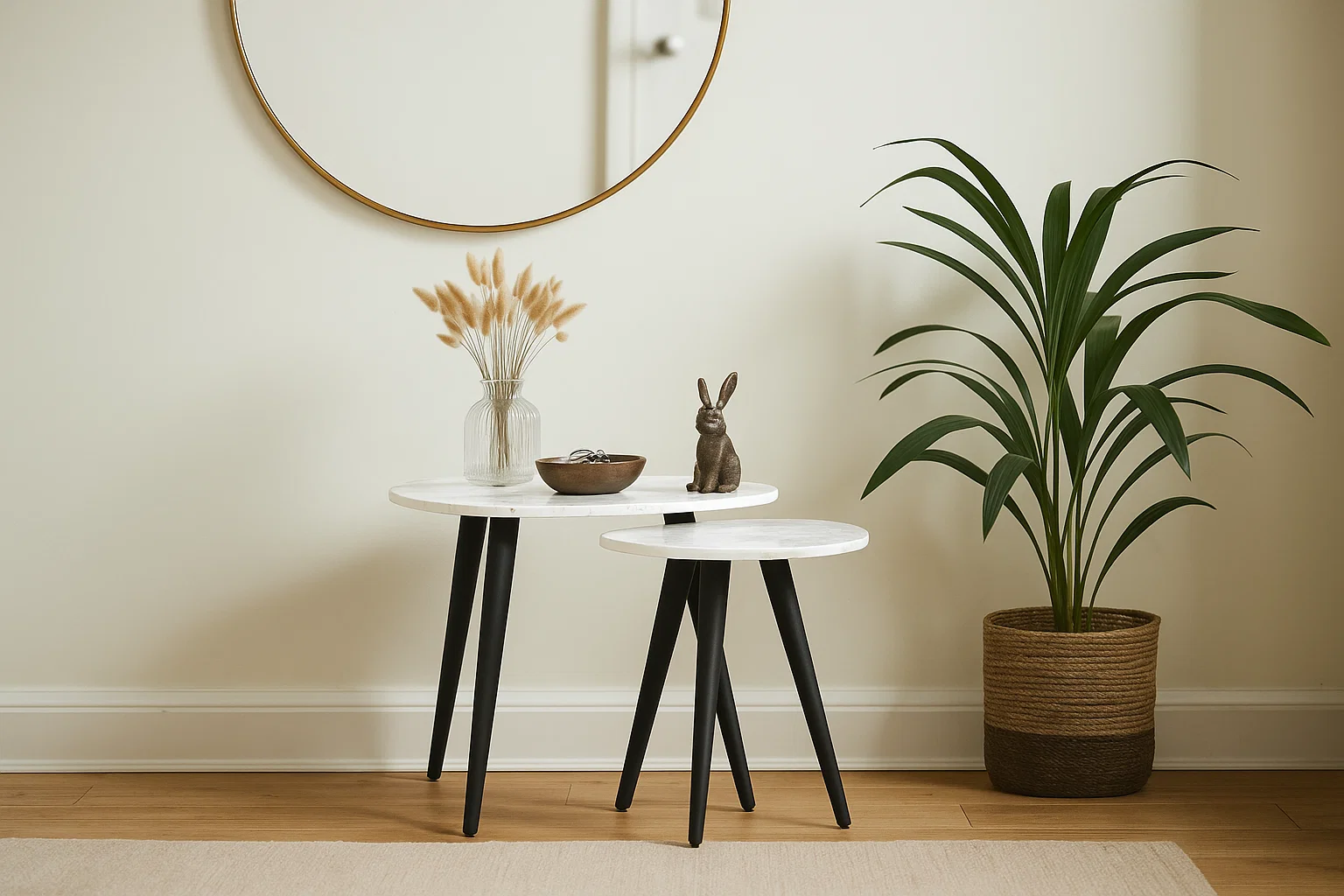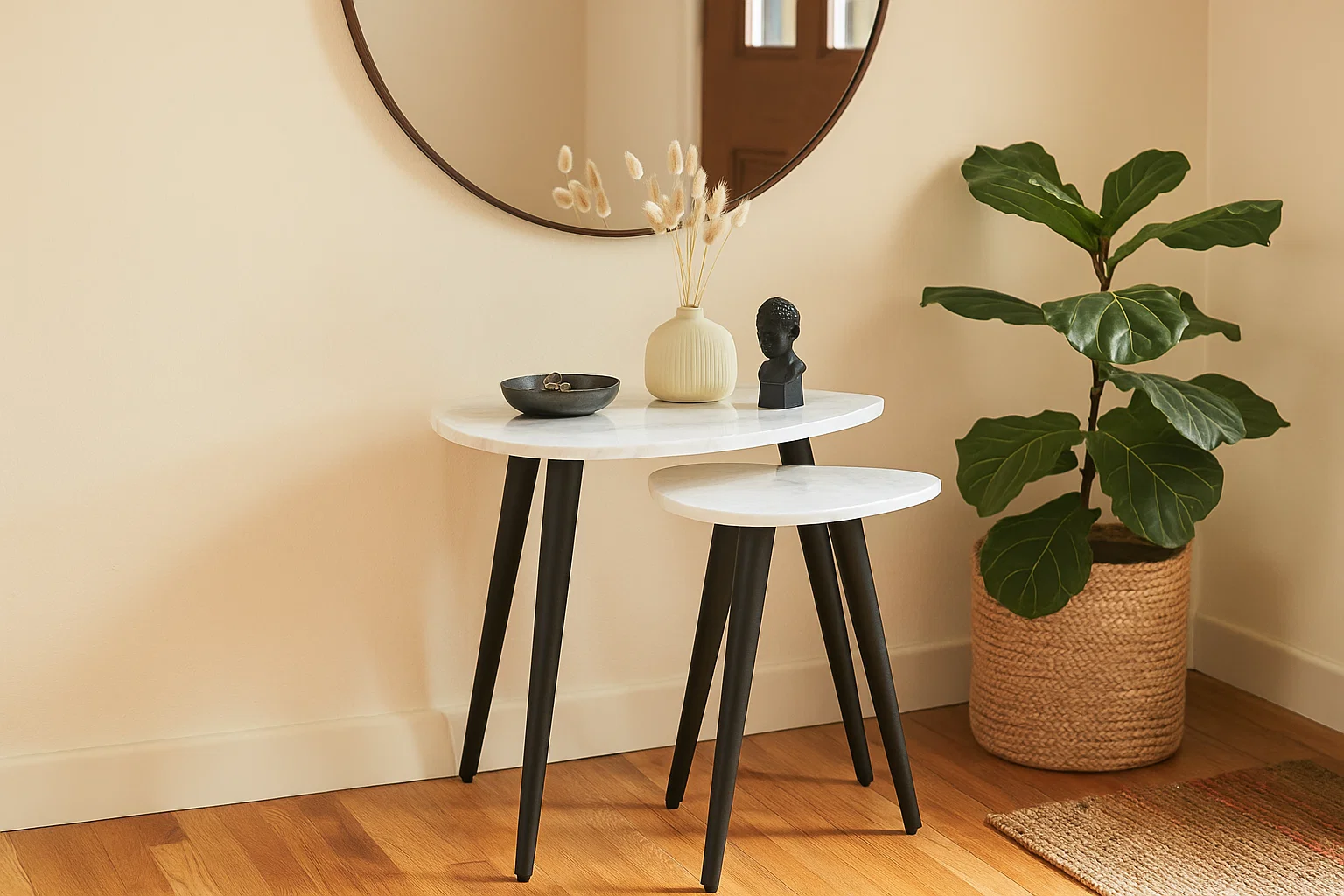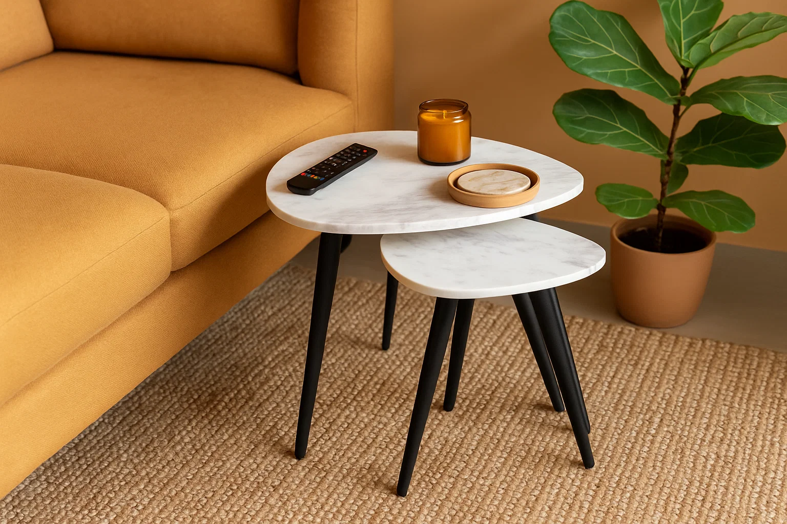 Crafted for balance and beauty, this Nest Table Set of Two features circular white marble tops and strong powder-coated steel legs. The minimalist frame design offers a modern look while allowing nesting flexibility—making them perfect for compact apartments or stylish lounges.