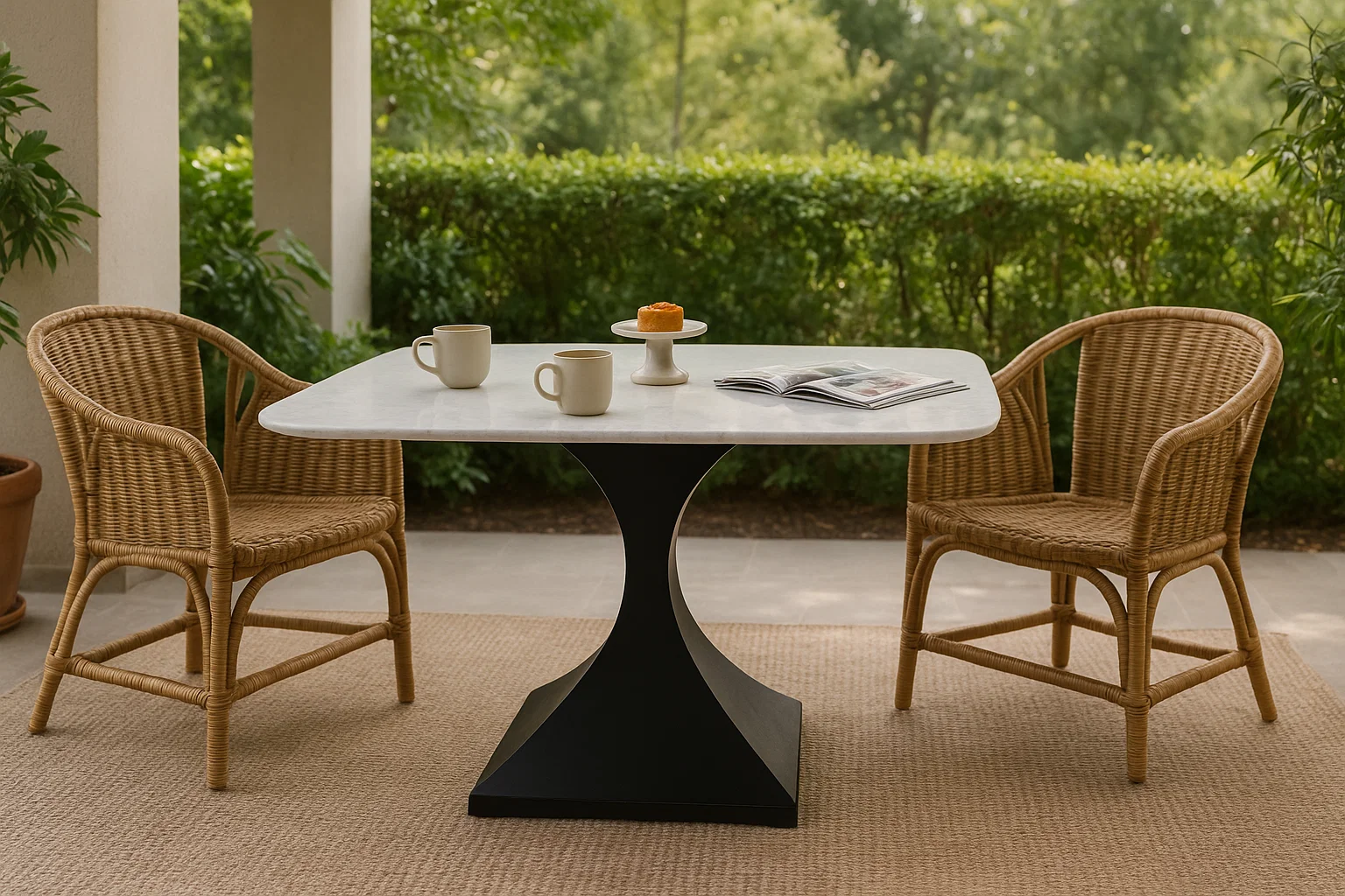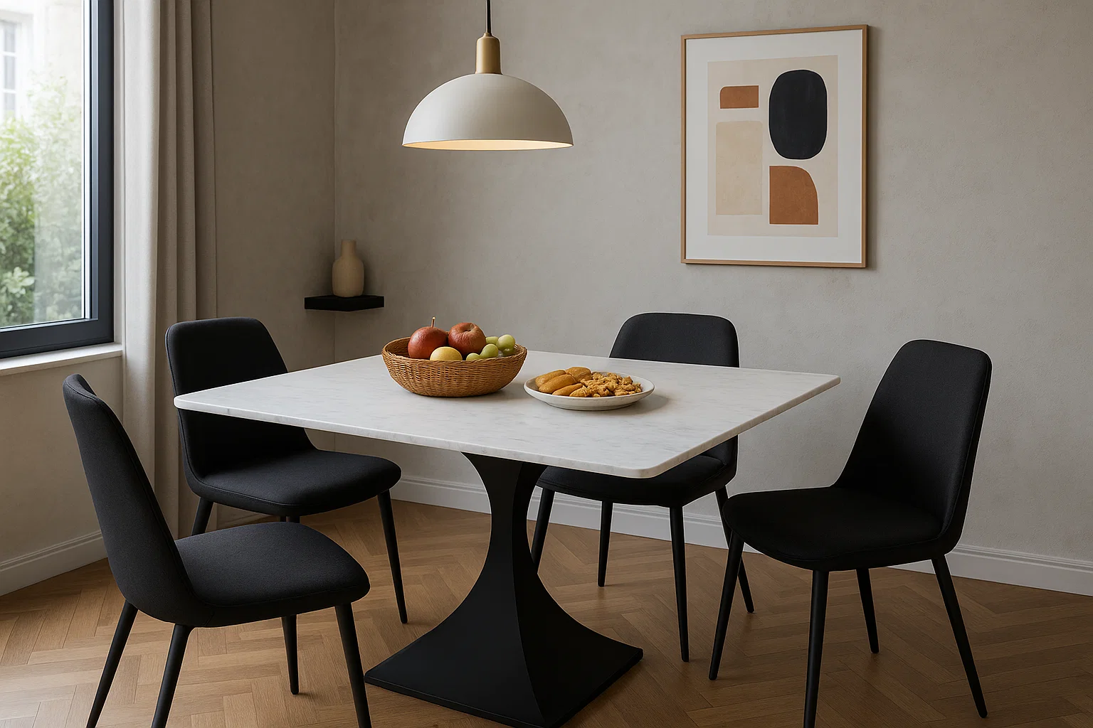 Bring balance and elegance to your dining area with the Square Architonce Dining Table. Showcasing a luxurious white marble top with clean edges and a square profile, this table is both modern and timeless. Its strong, powder-coated mild steel base delivers dependable strength while complementing the minimal marble surface, making it a versatile centerpiece for contemporary homes and refined interiors.